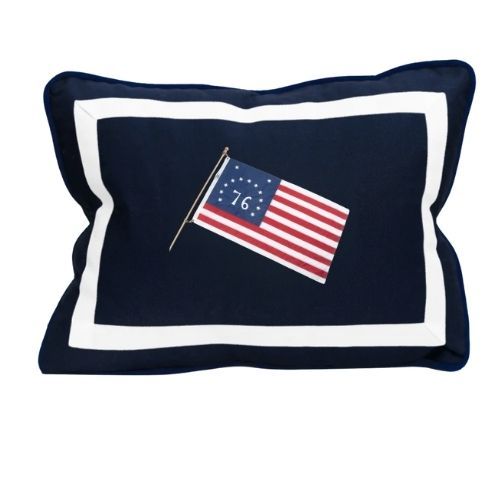 Celebrate 250 years of America with this outdoor emrboirdered pillow adorned with the image of Betsy Ross' handywork.