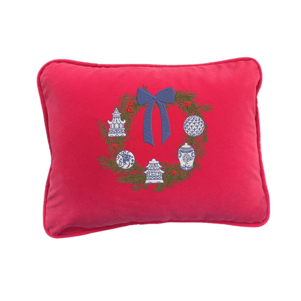 Luxurious 12x16" Hot Pink Velvet with matching welt, adorned with an embroidered Chinoiserie Holiday Wreath